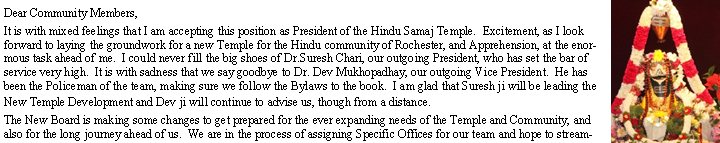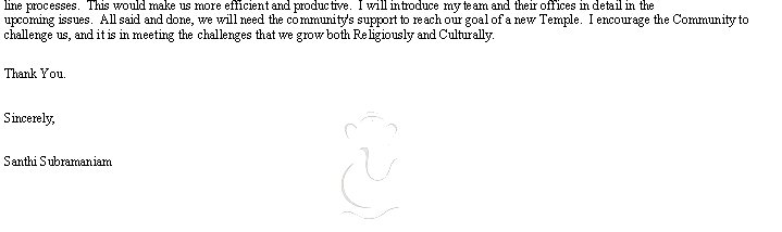 the new management takes over this month. Let’s all join in to support our Temple committee members who will be introduced by our President, Santhi Subramaniam, in future issues of Samarpan.
