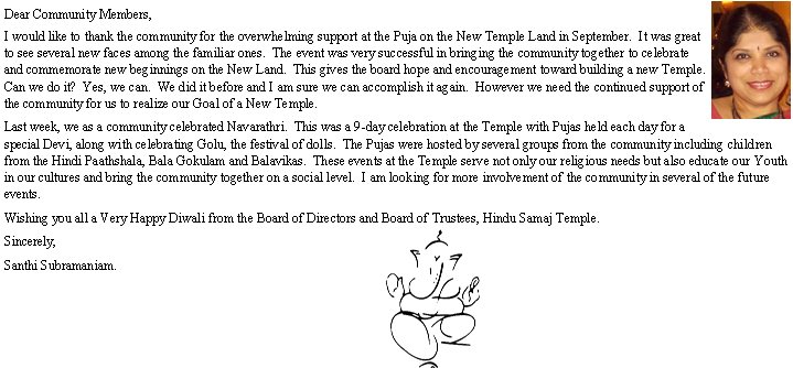 Diwali from the Board of Directors and Board of Trustees, Hindu Samaj