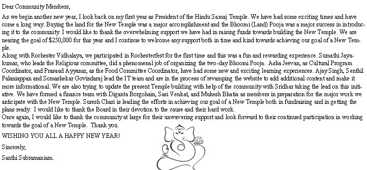 first year as President of the Hindu Samaj Temple. We have had some